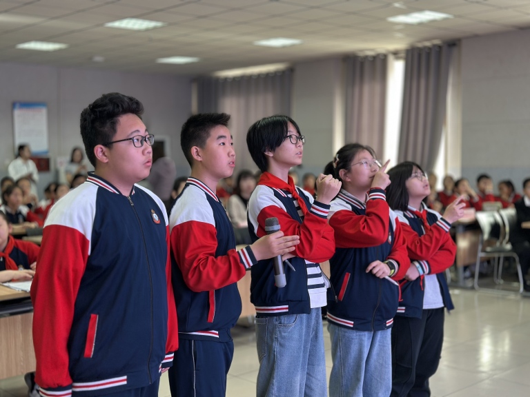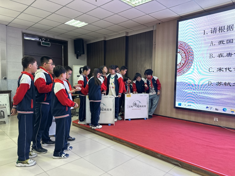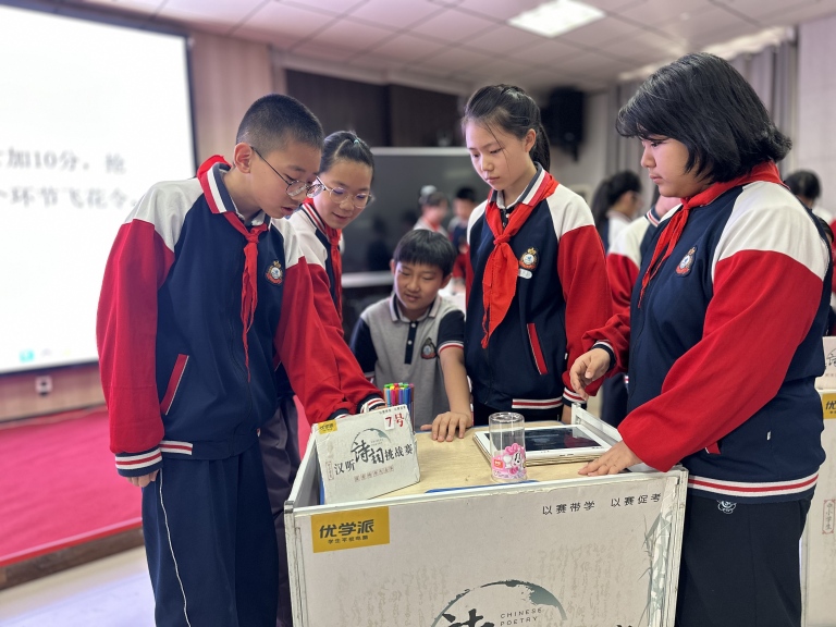 团队协舟,十题连闯,同学们或沉吟推敲,或脱口成诵,以"团结"为舟楫,智取诗海波澜。