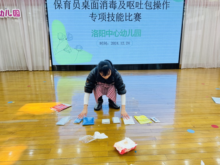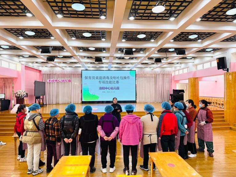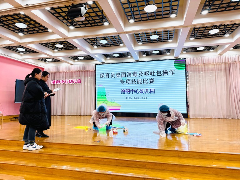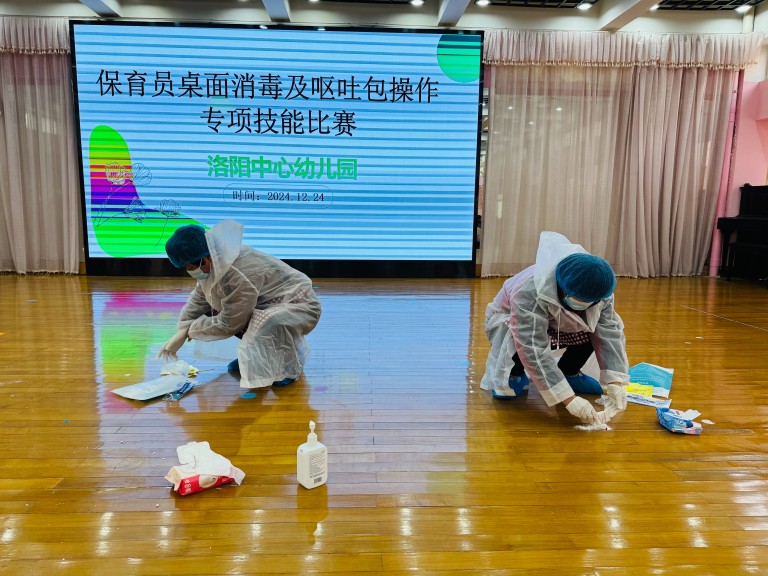 12月24日中午,洛幼的保育员们围绕着呕吐物处理和桌面消毒两大保育技能展开了一次技能比赛,全面检验了保育员们的专业素养和实操能力。