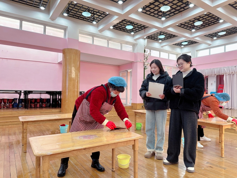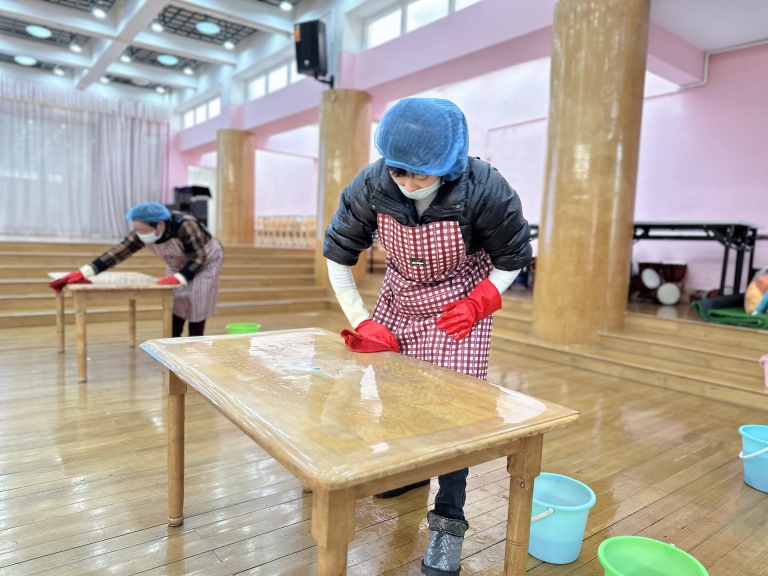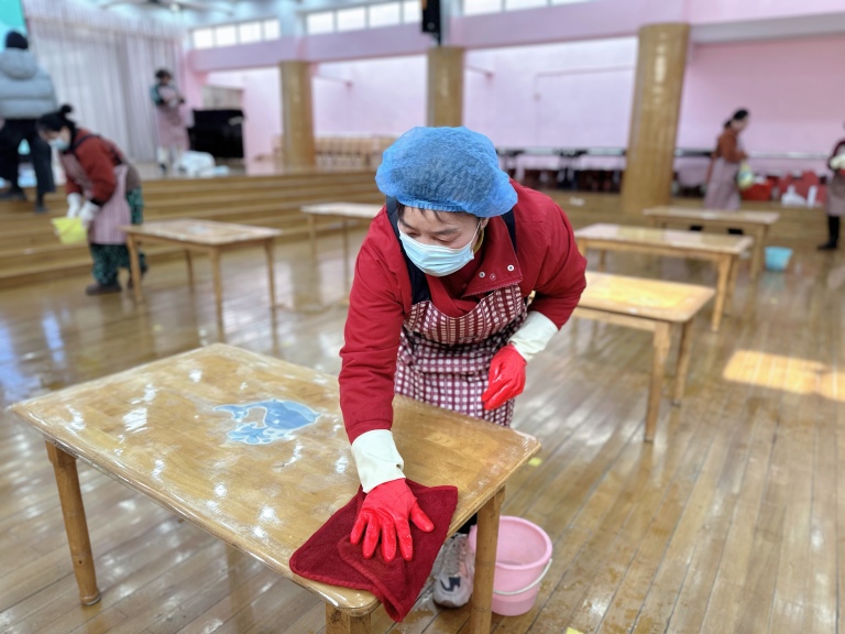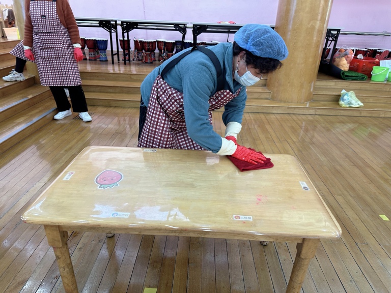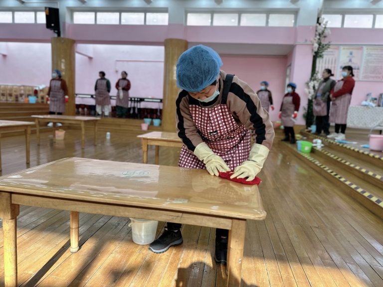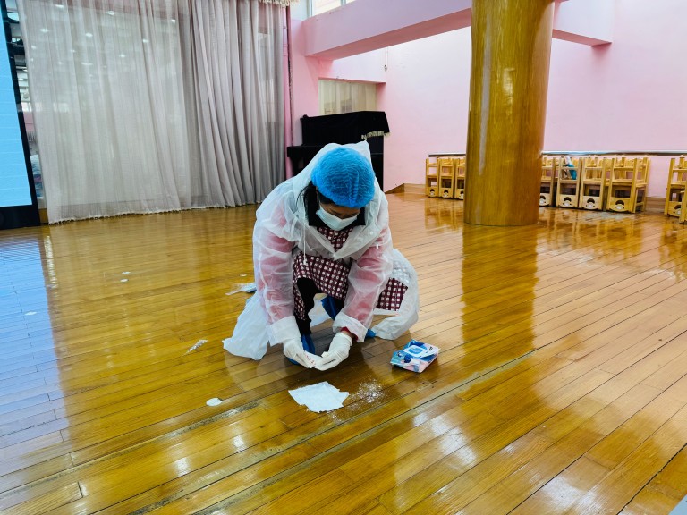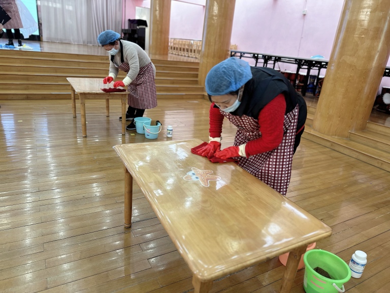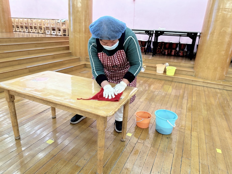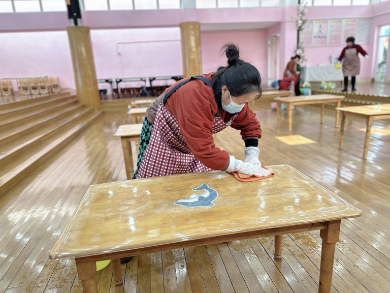 这一环节要求保育员们用正确的消毒比例,按照“清—消—清”的程序对桌面进行彻底清洁和消毒。保育员们佩戴手套,熟练地配制消毒液,用抹布单面单次擦拭桌面、桌边,然后进行消毒再清洗,确保桌面干净卫生,无消毒剂残留。整个过程中,保育员们动作娴熟,流程清晰,展现了她们严谨的工作态度和专业的操作技能。