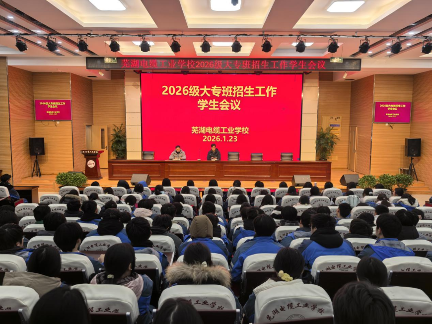 1月23日,招生就业处在学校报告厅组织召开2026级高职班招生工作学生会议,本次会议以“选择大专班,成就新高度,绘就精彩人生”为主题,共有482名学生参会。我校2026级高职班拟招收电子商务、新能源汽车技术两个专业,各50人;其中电子商务专业为三只松鼠(无为)有限责任公司订单培养,新能源汽车技术专业毕业生可享受推荐就业服务。