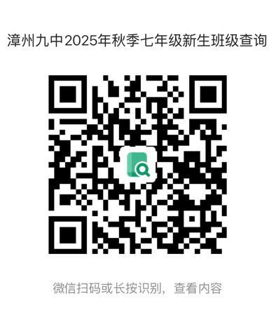 根据《龙文区2025年秋季“小升初”招生工作意见》、《漳州市第九中学2025年秋季招生简章》的文件要求,现公示我校2025年秋季七年级新生名单。请家长扫描下方二维码,输入学生姓名和身份证号,查看报到班级及座位号。(8月29日21:00后可查)