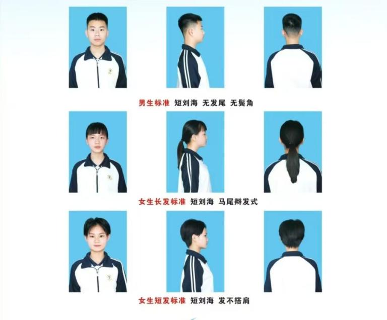 (1)发型要求学生标准发型应该简便、整洁、自然、长短适中,反映青少年学生朝气蓬勃的精神面貌。男生发型:不留长发,不剃光头;不烫发、不染发;做到前不扫眉、旁不遮耳、后不触领(衣领),侧鬓不过腮。女生发型:前额刘海不过眉、后面头发不过肩。不烫发、染发;不梳怪发型。