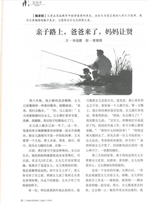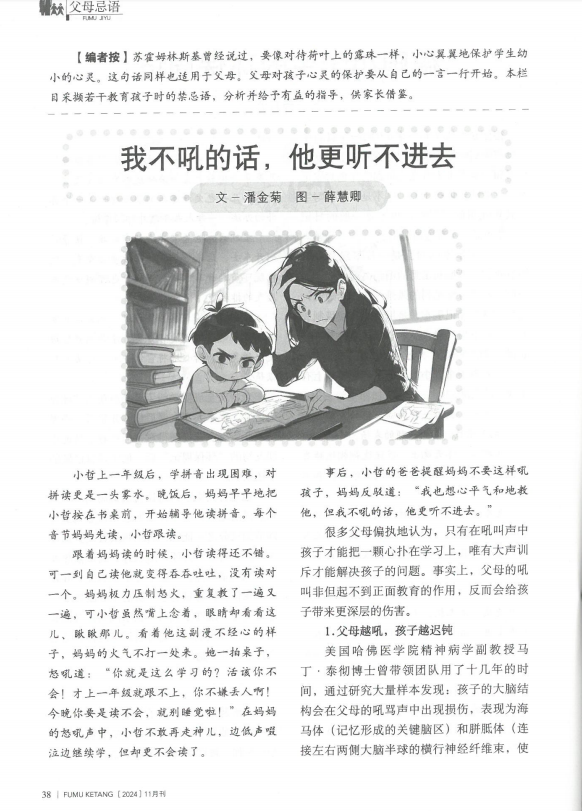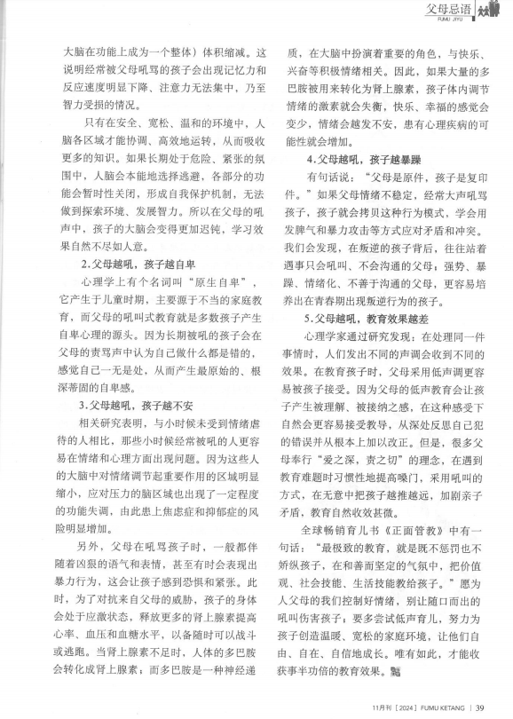 您好!家庭是孩子第一所学校,父母是孩子的第一任老师。家庭教育在孩子的成长历程中发挥着关键作用,父母与孩子共同成长的每一天,都是一段珍贵的旅程。以下是《父母课堂》2024年11月的推荐篇目,诚邀家长们踊跃阅读,学习家庭教育知识,掌握家庭教育科学理念和方法,从而找准方向,调整步伐,让我们一起成为孩子成长道路上最智慧、最贴心的引路人。