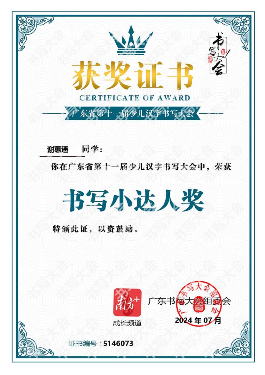 谢蕙遥,在广东省第十一届少儿汉字书写大会中,荣获“书写小达人”奖。她从初学书法时的笨拙笔触,到如今能在纸上自如地挥洒笔墨,这一路走来,她经历了无数的挑战与汗水的洗礼。记得刚开始练习书法时,谢蕙遥的字总是歪歪扭扭,不够工整。但她从未放弃,每天坚持练习,不断向老师虚心求教,反复观摩优秀作品,细心寻找自己的不足之处并加以改进。在这个过程中,谢蕙遥逐渐领悟到了书法的独特魅力。书法对她而言,已不仅仅是一种技艺的修炼,更是一种修身养性的途径。通过书写,她学会了耐心与专注,深刻体会到了坚持所带来的力量。每一次微小的进步都让谢蕙遥更加自信,每一次成功的突破都让她的信念更加坚定。