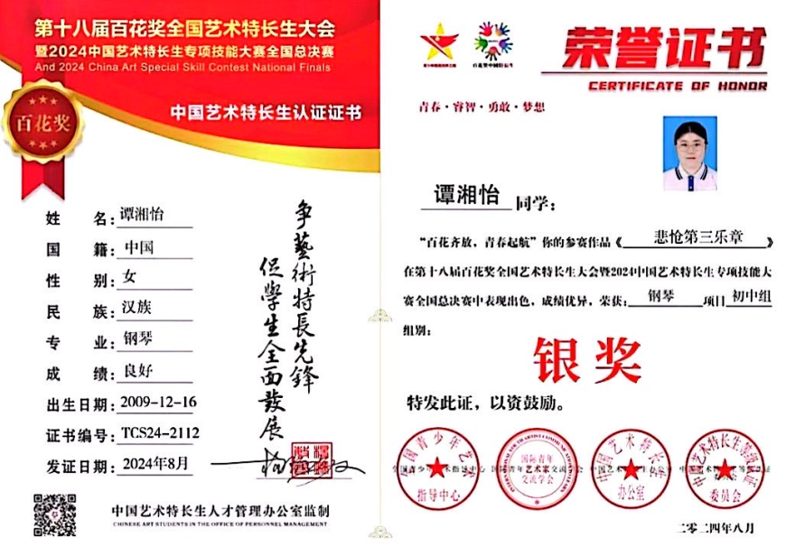 谭湘怡,在第十八届百花奖全国艺术特长生大会暨2024中国艺术特长生专项技能大赛全国总决赛中摘得银奖。她回顾比赛的日日夜夜,每一次练习都凝聚着她对艺术的无限热爱与不懈追求。这个奖项不仅是对谭湘怡辛勤努力的认可,更是对她坚持艺术梦想的一种巨大鼓励。谭湘怡衷心感谢母校为她搭建了一个展示自我的宝贵平台;感谢老师和同学们的温暖陪伴与坚定支持,是大家的鼓励让她在追梦路上勇往直前;更要深深感谢她的家人,是他们无私的爱与默默付出,让她能够全心全意地追逐艺术梦想。展望未来,谭湘怡将继续怀揣着对艺术的满腔热爱,坚定不移地前行。