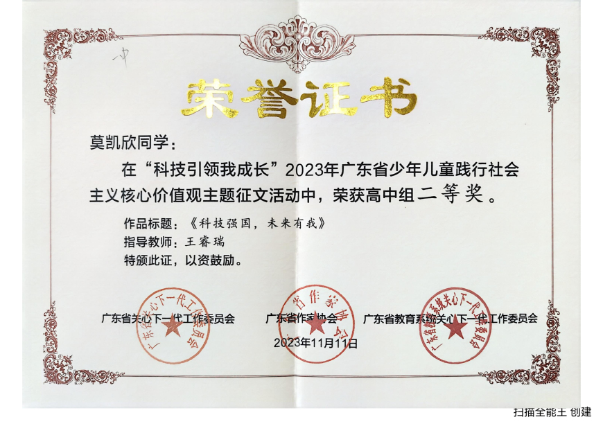 莫凯欣,长久以来对文学与科技抱有浓厚兴趣,在2021年电影《我和我的父辈》的启发下,她深刻体会到科技应蕴含人情味与生活气息。莫凯欣的科技作品《科技强国,未来有我》灵感来源于动画电影《铃芽之旅》,该作品极具生活趣味和科技感,完美展现了科技与动画的结合。在本次“科技引领我成长”的主题征文活动中,她将先前参加青少年科技创新大赛的经历写入作品,文章紧扣主题,细节丰富、真实,最终获得了广东省高中组征文二等奖。