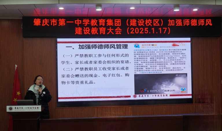 2025年1月17日,在忙碌与收获交织的学期尾声,肇庆市第一中学(教育集团)初中部各校区的教师齐聚一堂,召开学期末教师大会。本次大会全面回顾学期工作,强化师德师风,筑牢假期安全防线,并对优秀教师予以表彰,为新征程积蓄力量。