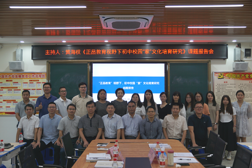 首先由课题主持人黄江镇教师发展中心黄海权副主任围绕课题《正品教育”视野下,初中校园“家”文化培育研究》作结题报告。他分别从问题的提出,解决的主要问题和解决问题的过程与方法、 主要研究成果、研究成果价值和研究成果创新点进行了详细汇报。黄主任介绍,2021年黄江中学被评为东莞市第三批品牌学校,基于学校优秀文化传统、办学特色和落实“立德树人”根本任务的要求,着力培育“正品教育”学校的品牌。据此,课题组在“正品教育”的视野下,进行初中校园“家”文化培育研究,将“正品教育”品牌学校与校园“家”文化培育相融合,促进“正品教育”学校品牌的建设。在汇报中,黄主任对课题进行反思和展望,表示将一如既往地在学校品牌“正品教育”视野下,深化校园家文化培育的深入研究,特别是在家校的共育、促进学生良好心理健康养成等方面有更深入的研究以获取更大的成果与效益。