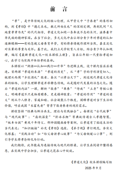 作为活动的重要载体,学校自主研发的《孝道文化》校本课程同步投入使用。该课程以“溯源-认知-践行-升华”为逻辑框架,设十大专题,通过“经典+案例+实践”的三维设计,实现传统文化与现代教育的有机融合。