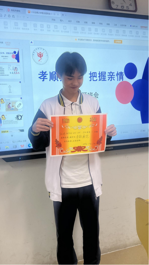 为持续深化孝道文化传承,让慕范教育融入班级生活,仙游二中各班级陆续举行“孝敬之星”内部表彰活动。作为“溯源孝道文化,唤醒情感共鸣”主题系列活动的关键环节,班级层面的表彰以更贴近学生生活的形式,表彰身边孝行典范,让“敬长孝亲”的种子在同窗榜样的引领下生根发芽。各班级的表彰活动由班主任主持,氛围温馨而热烈。在同学们的掌声中,班主任为“孝敬之星”颁发学校奖状。获奖同学分享孝亲心得时,朴实的话语引发强烈共鸣:“帮妈妈洗碗、听爷爷讲过去的事,这些小事让我明白,孝心就藏在日常里。”随后,班级同学围绕“向身边榜样学习”展开交流,不少同学表示要从主动分担家务、耐心倾听长辈教诲等小事做起,践行孝道。班主任在总结中强调,班级“孝敬之星”是同学们看得见、学得到的榜样。本次表彰不是终点,而是孝善行动的新起点,希望全体同学以榜样为镜,将慕范之心转化为践行之举,让孝亲敬老成为班级新风尚。此次班级内部表彰,让慕范教育更接地气、更具温度,有效推动了孝道文化在校园的日常化传播,为班级德育建设注入了鲜活力量。