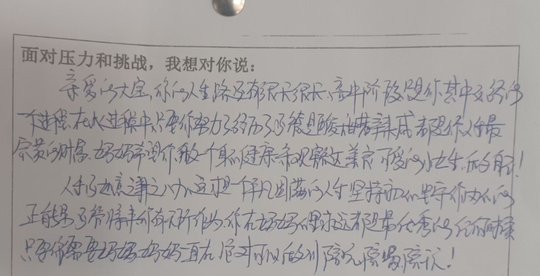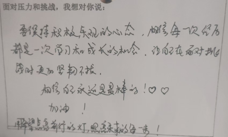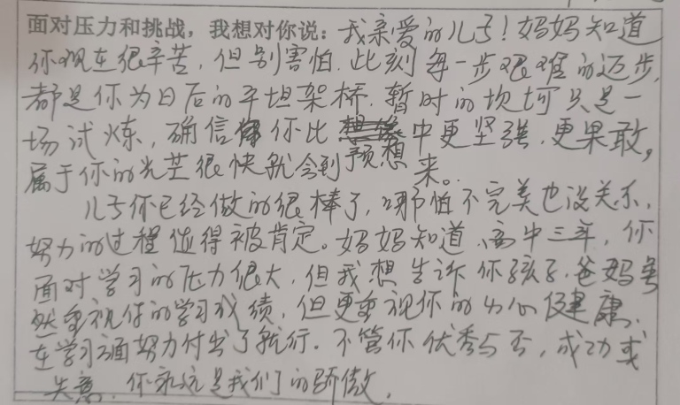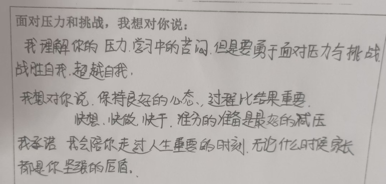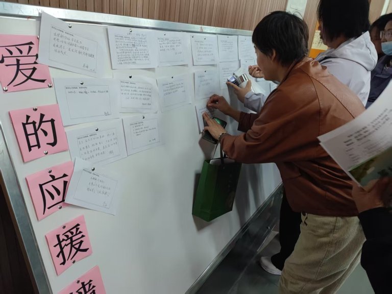 课程温情的高潮——“爱的应援墙”活动,让家长们将“孩子,无论成绩如何,你都是我们的骄傲”等心里话写在卡片上。这面展示在高二级部的应援墙,无声却有力地告诉每一个孩子:你的奋斗,我们看得见;你的身后,永远有我们最坚实的应援!