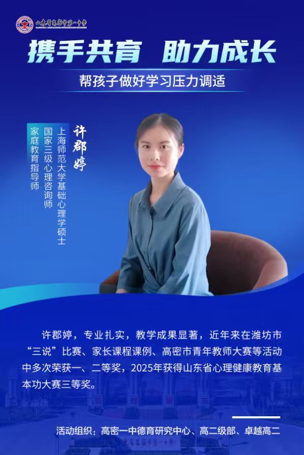 10月26日,高密一中部分家长齐聚校园,共同参与了一场主题为“帮助孩子做好学习压力调适”的家长课程。本次活动由许郡婷老师主讲,围绕“减压赋能,护航成长”的主题,通过一场走心、入脑、见行动的探索,为家长和孩子减压赋能,助力他们自信应对学习和生活中的挑战。