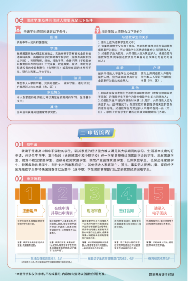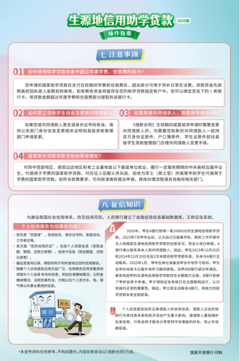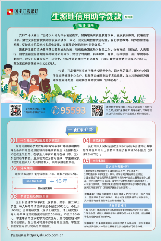 “不让一个学生因家庭经济困难而失学!”生源地信用助学贷款,是指国家开发银行等金融机构向符合条件的家庭经济困难的学生(含预科生)发放的、在学生入学前户籍所在县(市、区)办理的助学贷款。生源地贷款为信用贷款,学生和家长(或其他监护人等)为共同借款人,共同承担还款责任。“助学,筑梦,铸人”,这是祖国给予千万学生一展鸿鹄之志的好政策。