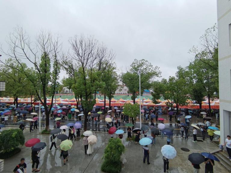 展棚内处处可见求知若渴的身影,湿漉漉的雨伞下,是一双双紧盯资料、充满期待的眼睛。老师们的解答声、雨声、讨论声交织,奏响了一曲不畏风雨、执着追梦的青春乐章,映衬出全体高三学子及家长对理想未来那份风雨无阻、矢志不渝的决心与热情。