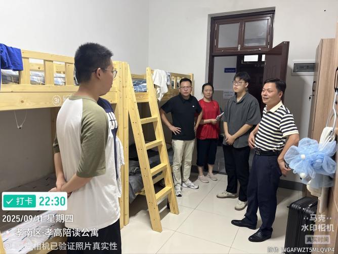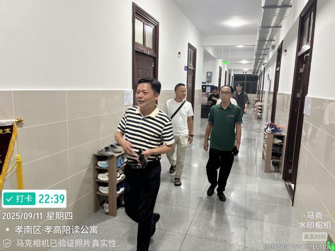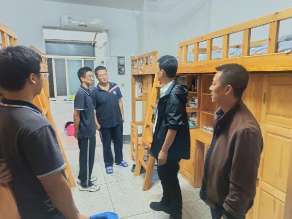 9月17日(星期三),下晚自习后,党委委员、副校长齐如意,奥美高中副校长李立红,大数据中心主任王波,孝感高中高一年级主任曾晓辉,走进高一年级男生寝室,看望慰问学生,并开展交流研讨。