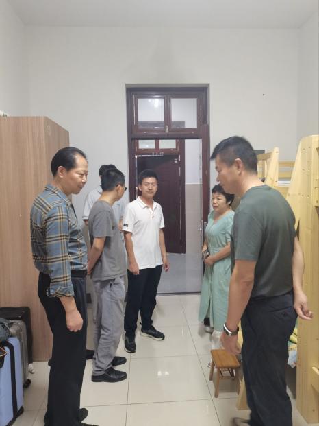 9月16日(星期二),下晚自习后,党委副书记、校长程敬荣,党委委员、副校长李姣娥,奥美高中工会主席孙林,孝感高中高一年级主任曾晓辉,奥美高中高一年级主任李诚等一行,走进高一年级在西区⑥号宿舍楼的男生寝室,看望慰问学生,了解入住情况。