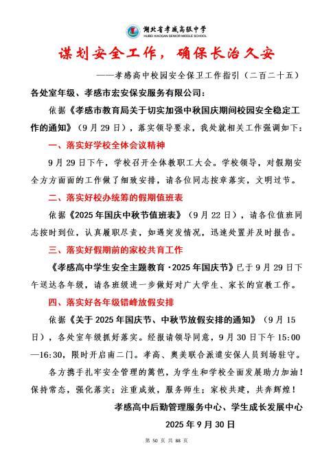 9月30日上午,依据《孝感市教育局关于切实加强中秋国庆期间校园安全稳定工作的通知》(9月29日),落实领导要求,孝感高中后勤管理服务中心、学生成长发展中心联合发布《工作指引》,有针对性地就“落实好学校全体会议精神,落实好校办统筹的假期值班表,落实好假期前的家校共育工作,落实好各年级错峰放假安排”等四个方面的工作进行了全面部署和统筹安排。