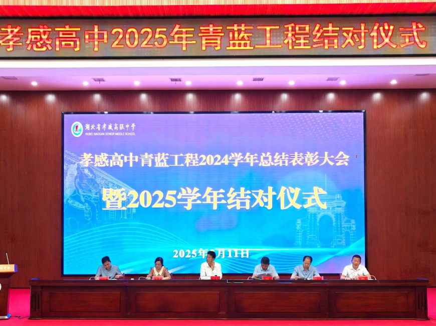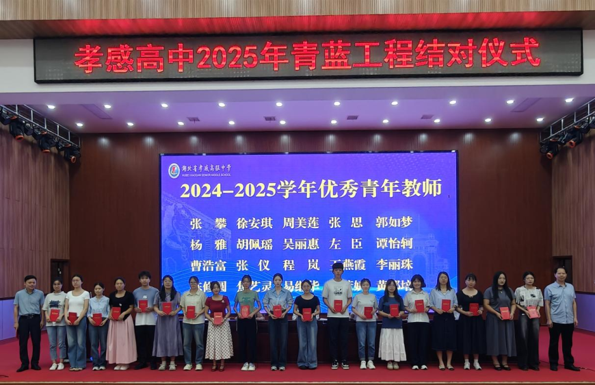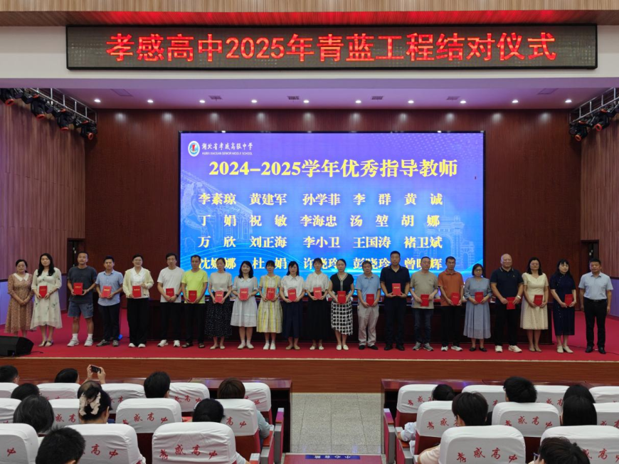 2025年9月12日下午,孝感高中召开“青蓝工程”总结表彰大会,并举行新学年师徒结对仪式。该活动旨在强化教师队伍建设,发挥骨干教师的示范与引领作用,通过“传帮带”机制,助力青年教师提升教学与德育能力,实现专业快速成长。“青蓝工程”取自“青,出于蓝而胜于蓝”的寓意,着眼于构建教师发展共同体,推动学校教育教学质量的持续提升。活动由党委委员、副校长罗华荣主持,校领导班子、相关中心负责人、学科教研中心主任、备课组长及指导老师、青年教师共180余人参加了会议。会议总结2024-2025学年师徒结对工作,颁发优秀青年教师、优秀指导教师等奖项,共计40位获奖老师上台领奖,4位师徒代表发言,隆重举行了2025学年师徒结对仪式,最后,党委副书记、校长程敬荣作指导讲话。