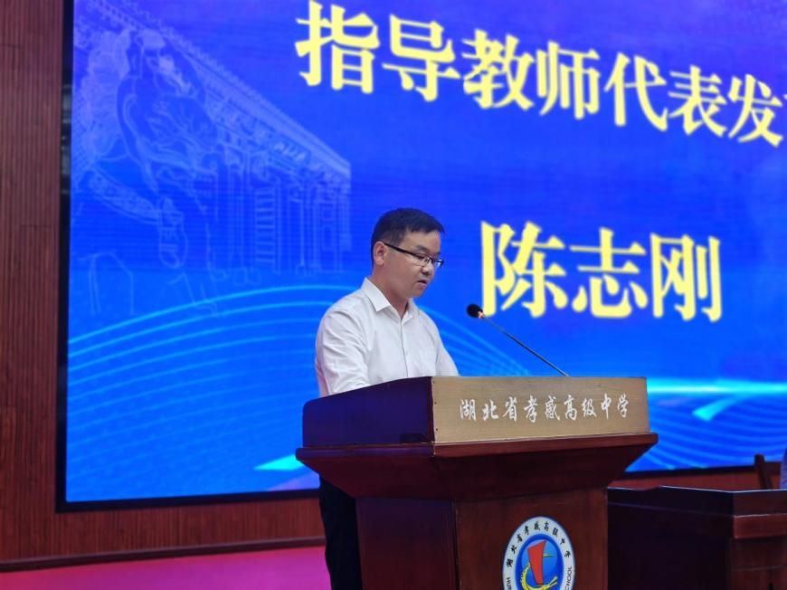 指导教师代表陈志刚老师结合自己二十余年的教学与班主任工作经验,表示将从"班主任管理"和"学科教学"两个方向对新教师陈子健进行全方位指导,通过"先听课、后上课,多打磨、共提升"的方式帮助新教师成长。陈老师强调,师徒结对不仅是经验传承,更是"双向成长"的过程,新教师带来的新技术、新思维也将为教学注入活力。他承诺将倾囊相授,与新教师共同探索教育创新,为学校教育事业贡献力量。