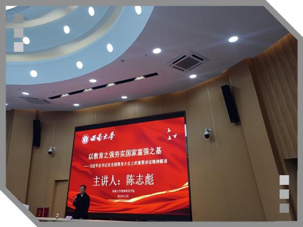培训的前两天,我们聆听了专家的四场讲座。给我们做第一场讲座的是中共重庆市委讲师团成员、四川外语大学原副校长陈志彪教授,报告的题目是《以教育之强夯实国家富强之基——深入学习习近平总书记在全国教育大会上的重要讲话精神》。陈教授69岁,全程脱稿,站着讲授了两个半小时的课,他精神矍铄、条理清楚、直击重点,尤其是他惊人的记忆力以及对报告的解读能力和对人生的感悟给我就下了深刻的印象。他的报告紧扣七个重点,鞭辟入里地剖析教育要义与新时代教师的使命担当。特别是他总结的:人生的十条精华;会工作会做事十条;说话的十条艺术以及“山”“水”的哲学道理,让我受益匪浅。