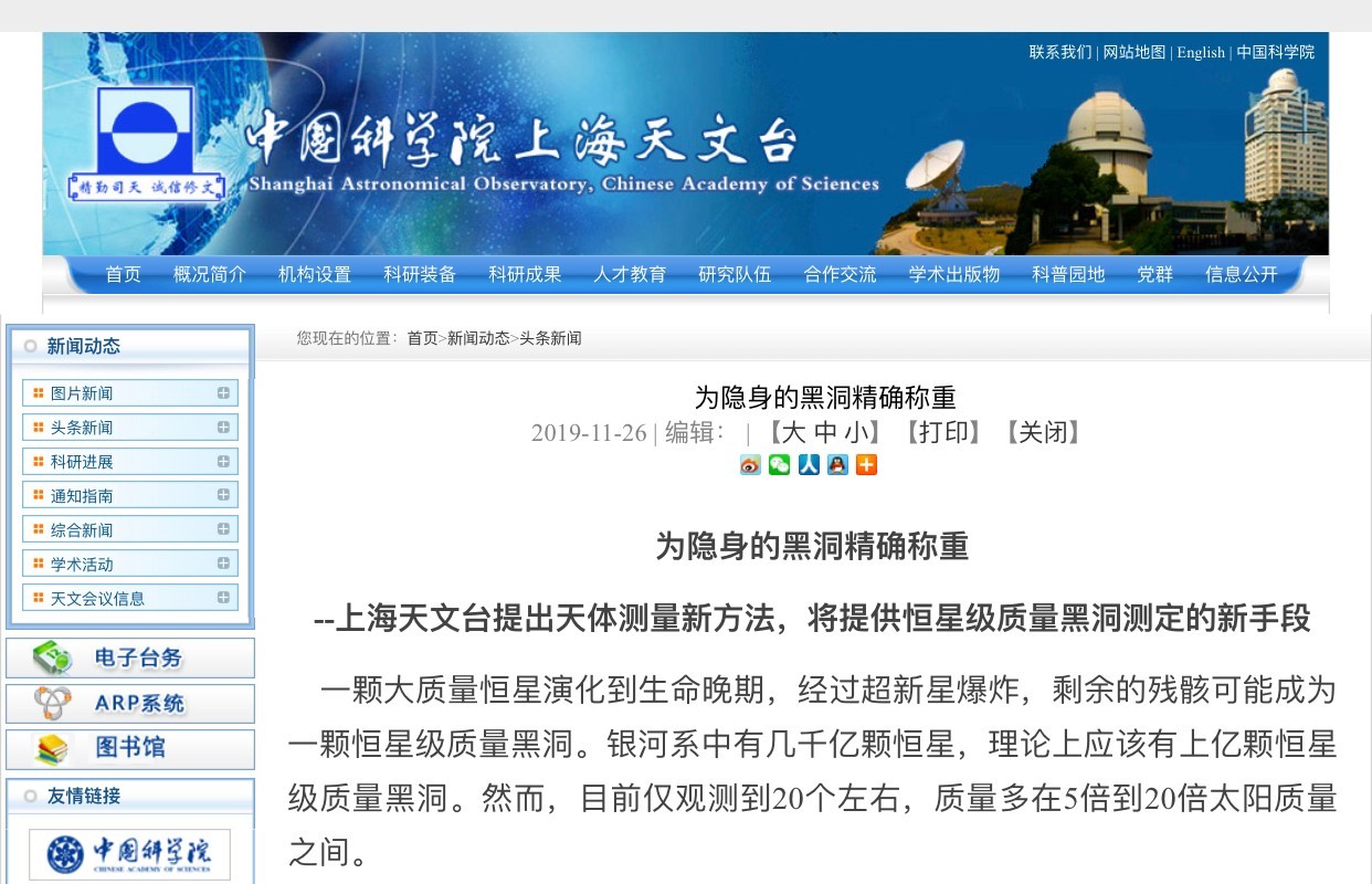 2019年9月份成功研发出了针对Gaia卫星原始观测数据精准解算“隐身天体”质量的软件,可利用实测数据测定恒星位置、距离、自行、黑洞质量以及系外行星质量(整个欧空局Gaia数据团队,目前仅有上海团队实现了此功能)。2019年初,上海天文台(齐朝祥、廖石龙)与国家天文台刘继峰等人联合申请了2019年度国家自然基金重点项目《致密天体质量分布研究》,目前该项目已正式获得批准(1193000332),我们将努力发现更多中小质量黑洞并测定其质量分布,这也将开启天体测量学的新方向。(end)