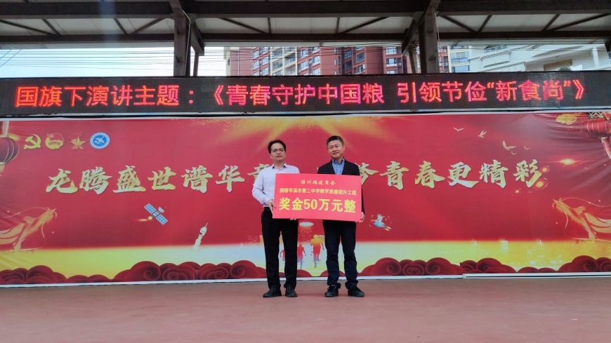活动伊始,梧州福建商会黄清池会长向我校捐赠奖金50万元,罗展坤校长代表学校接受捐赠。学校党委李宗文书记带领全校师生共同见证捐赠仪式。