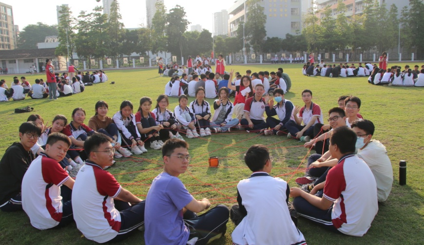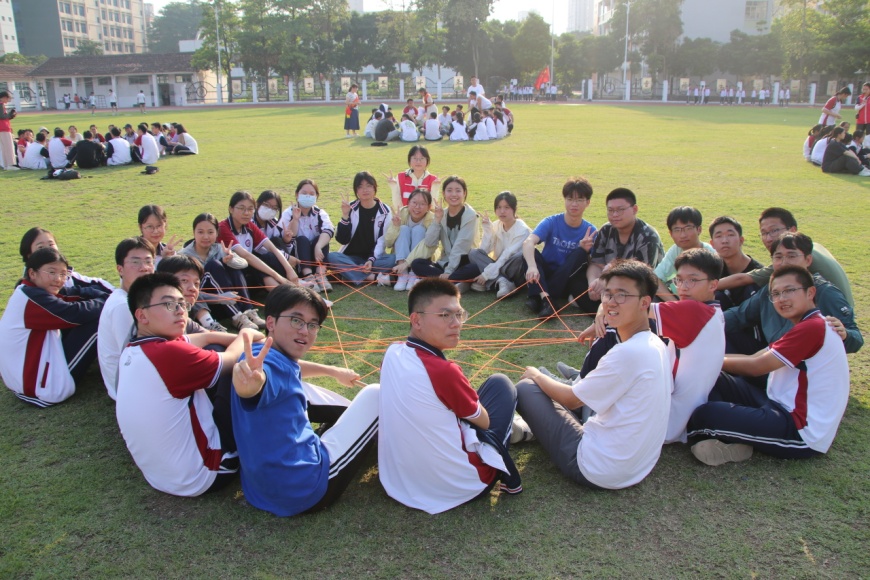活动尾声,"丝带相连,共赴新程 —— 编织人际网" 环节。在 "高考倒计时 XX 天,我想对你说..." 的情境下,鼓励大家向小组内的伙伴敞开心扉。随着一句句真挚话语流淌,红色丝带在同学们手中接续传递,宛如情感的纽带,将每个人紧紧相连。10 分钟的限时活动里,现场充盈着轻柔的交谈声,大家默契配合,让零散的丝带蜕变为团结友爱的象征,编织出深厚的同窗情谊。