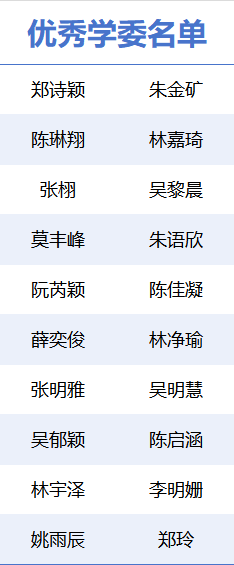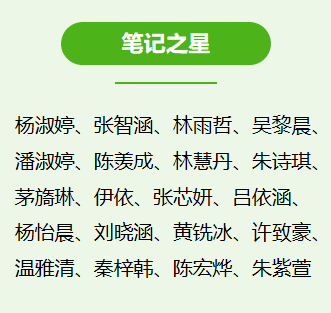 优秀名单:朱紫怡、林偌玲,黄梓琳、林海艳、陈佳凝、朱语欣、朱语欣、陈静怡、刘承缙、刘承缙