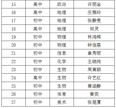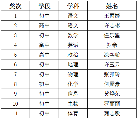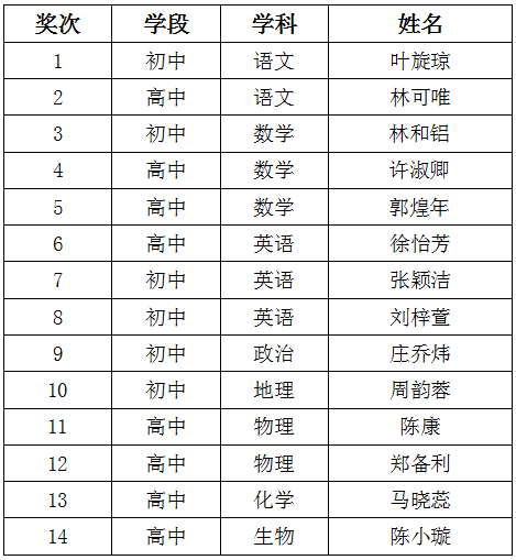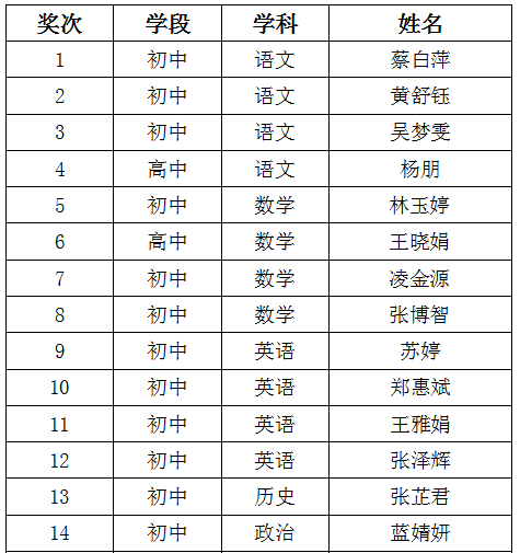 2025年5月10日,漳州三中青年教师教学比赛圆满收官。参赛教师同台竞技、各展所长,经激烈角逐,共评选出一等奖11名、二等奖14名、三等奖27名。现将获奖名单公布如下(排名不分先后)。