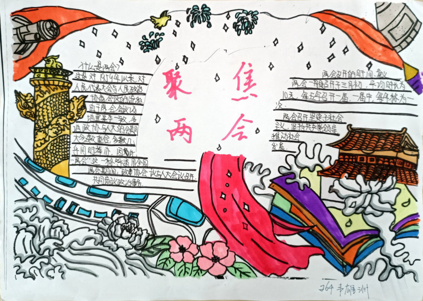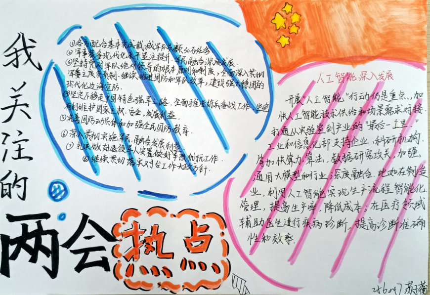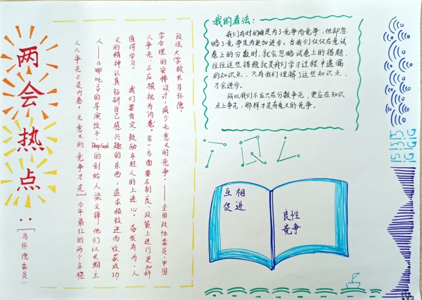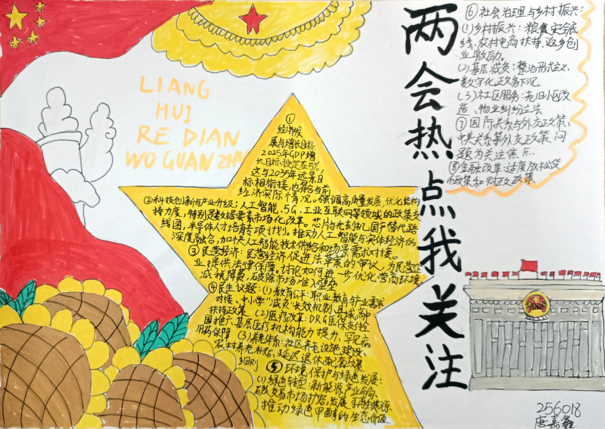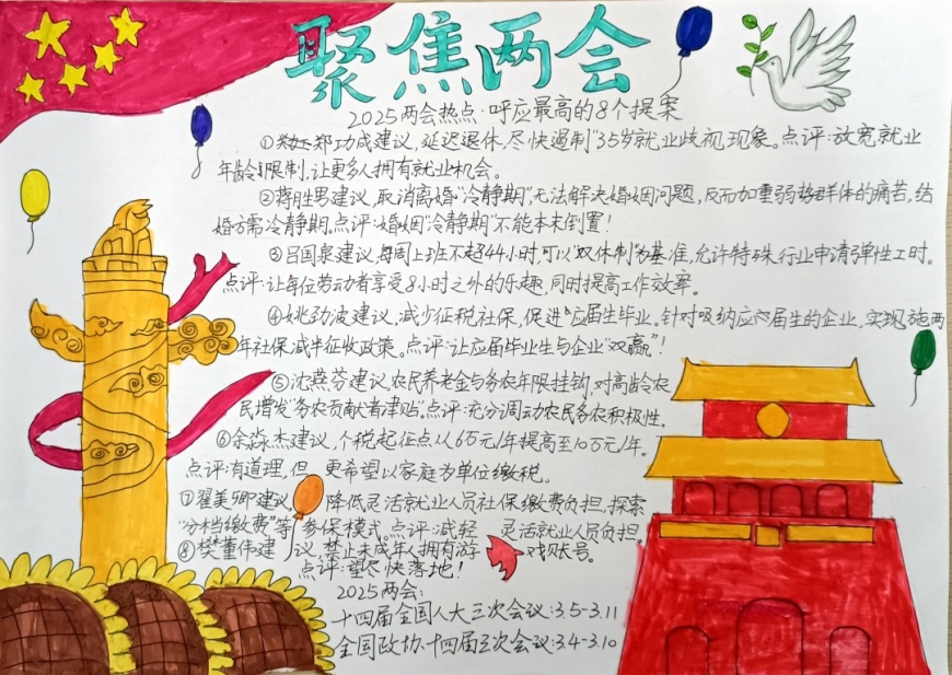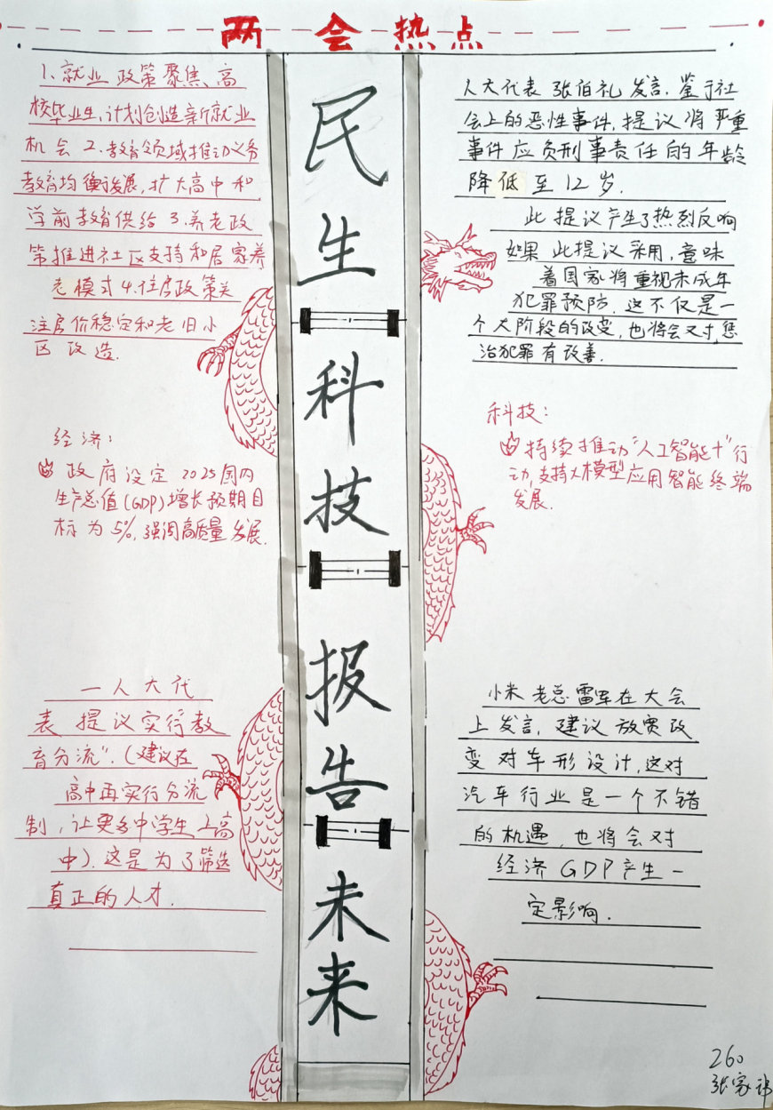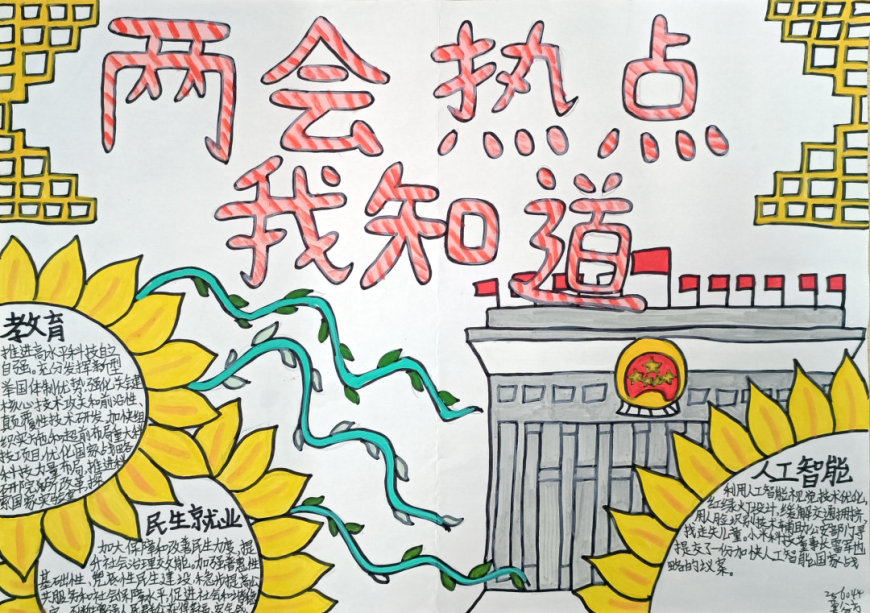 在手抄报创作过程中,学生们充分发挥了想象力和创造力。有的作品以“民生热点”为主题,描绘了未来美好生活的场景;有的作品聚焦“绿色发展”,呼吁保护生态环境;还有的作品关注“教育公平”,表达了青少年对优质教育资源的渴望。每一份手抄报都凝聚了学生们的心血,展现了他们对国家发展的关注与思考。