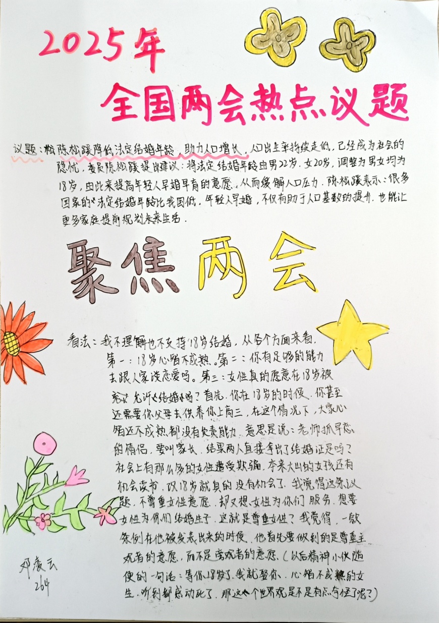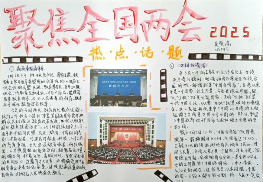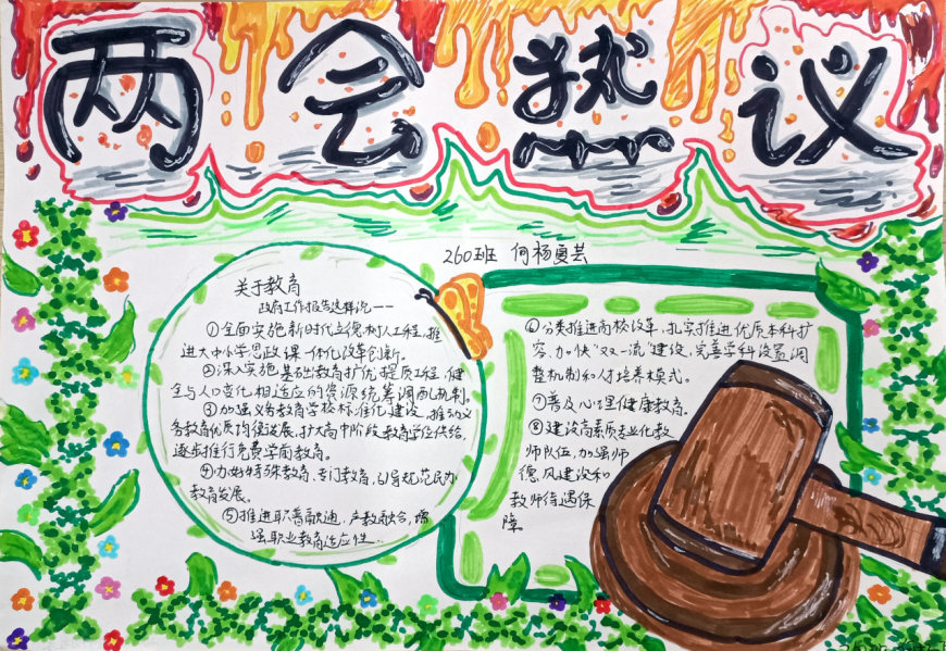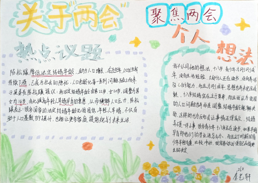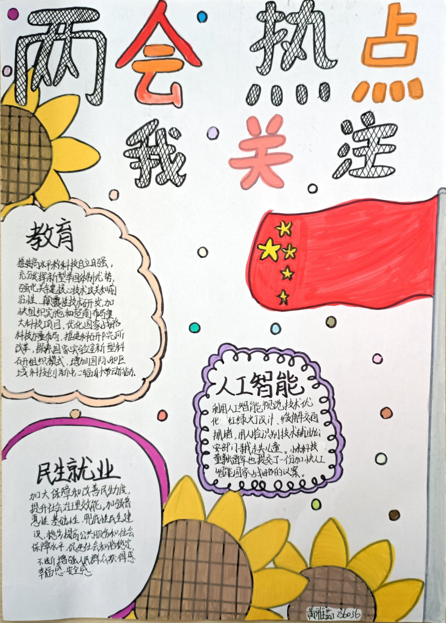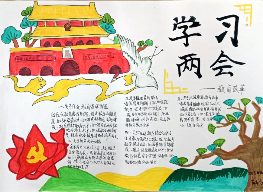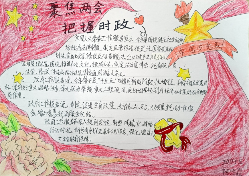 在手抄报创作过程中,学生们充分发挥了想象力和创造力。有的作品以“民生热点”为主题,描绘了未来美好生活的场景;有的作品聚焦“绿色发展”,呼吁保护生态环境;还有的作品关注“教育公平”,表达了青少年对优质教育资源的渴望。每一份手抄报都凝聚了学生们的心血,展现了他们对国家发展的关注与思考。
