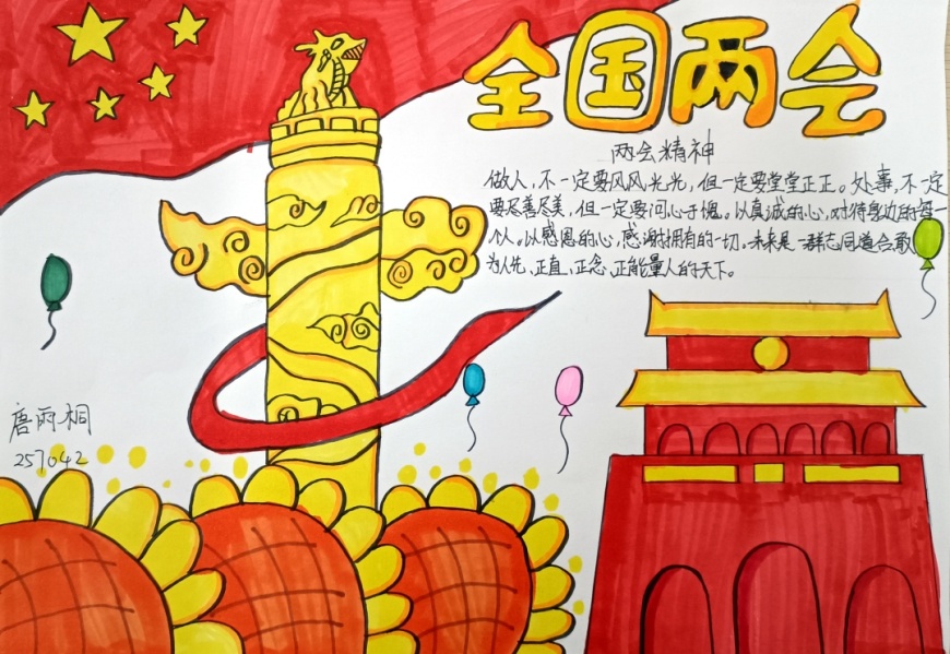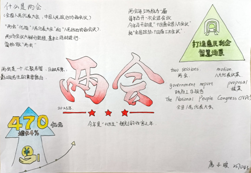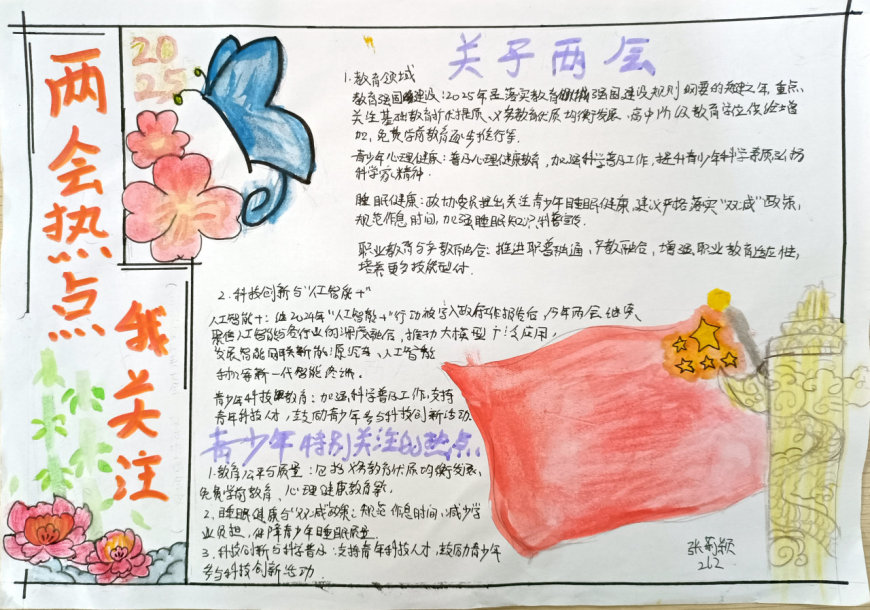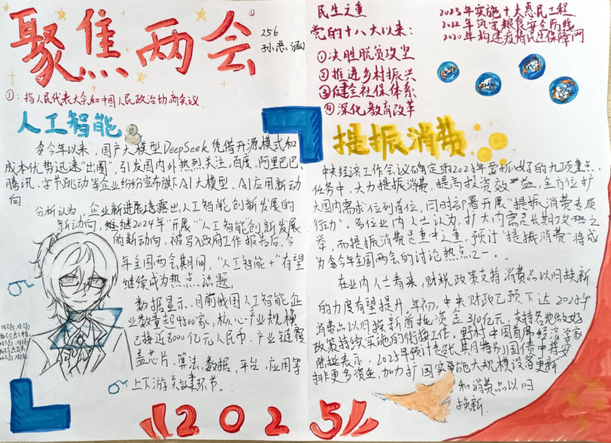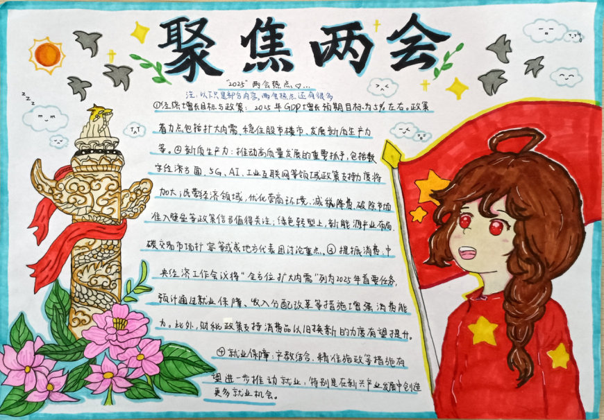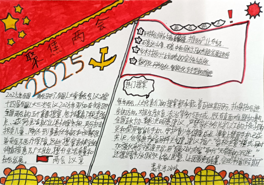 2025年全国两会是我国政治生活中的一件大事,会议围绕经济高质量发展、科技创新、教育改革、生态文明建设等热点议题展开了深入讨论。为了让青少年更好地理解国家发展方向,增强社会责任感,奎光学校政治组特别策划了此次手抄报活动。八年级学生通过查阅资料、小组讨论、创意设计等环节,将两会热点与自己的思考相结合,用手抄报的形式表达了对国家未来的美好愿景。