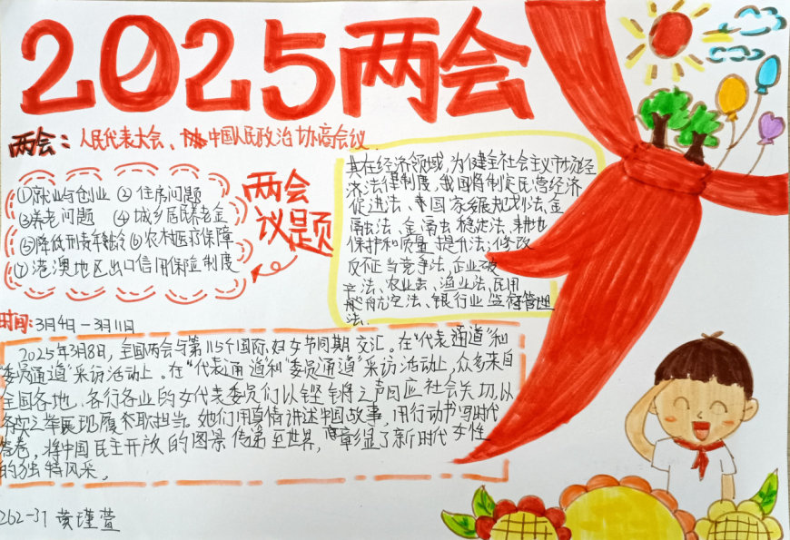 “大思政课”我们要善用之,一定要跟现实结合起来。为贯彻落实习近平总书记对思政课提出的要求,在2025年全国“两会”召开之时,桂林市奎光学校组织开展了以“两会热点我关注”的主题手抄报创作活动。此次活动不仅让学生们深入了解了两会的核心议题,还通过创意表达展现了新时代青少年的责任与担当。